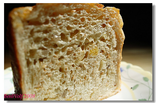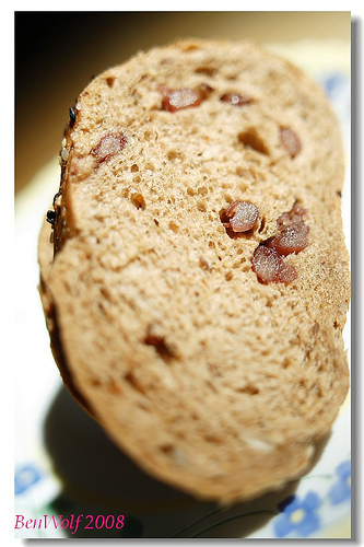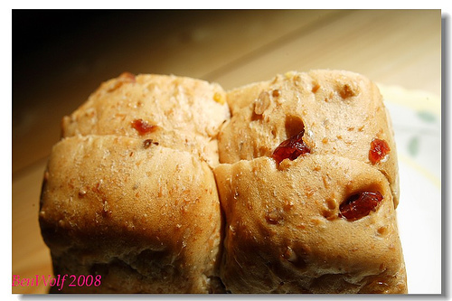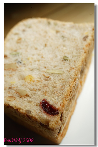 這是蔓越莓土司。這些蔓越莓不只是灑在表皮當裝飾用的,