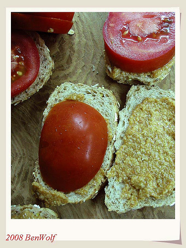 3.將2的醬抹上餐包,並覆上牛蕃茄,再抺上一層醬。