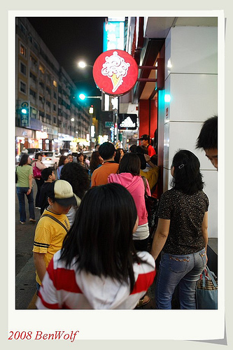 跟著人龍走,還不知要排哪一邊,選了最危險、最靠近馬路的這條,