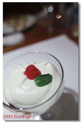 底下是層脆餅,上層是蛋白霜之類的,紅的是覆盆子,綠的是薄荷,
