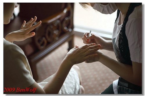 Amanda細細為P上指甲油。這雙手,平常很忙,忙著上課研究工作,直到這天才有機會給Amanda塗上蔻丹。P還數度忘了未乾的指甲油,頻頻在裙上劃了好幾次,Amanda也細細又補了好幾次。