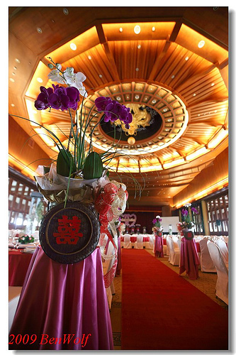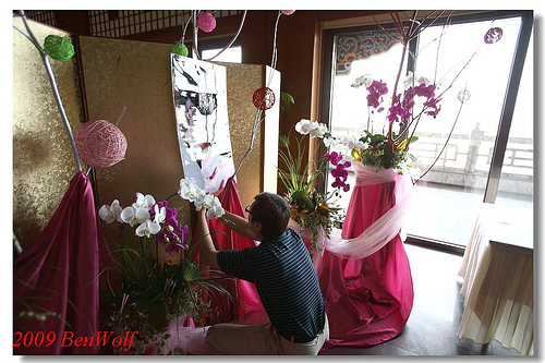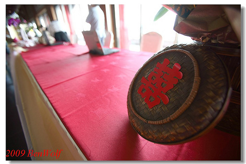 宴會廳外的桌子還沒有太多的佈置,有的是更早就擺放好的花朵及竹籃。再不久,這兒就會是工作人員的天下了。