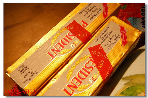法國總統牌奶油,就算在皇后烘焙裡的特價,500公克的約莫也要200元,而此刻在百貨公司裡的特價商品, 原價60元100公克的奶油,竟是買一送一,換算成單價的話,100公克只要30元,超級划算的!於是,我在櫃前算算價格後,也很快出手了。要不是冰箱太小,恐怕我會去多抱幾條回家囤起來!