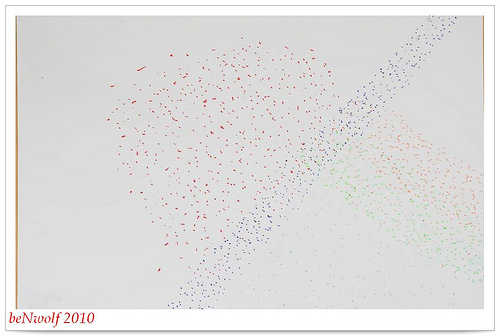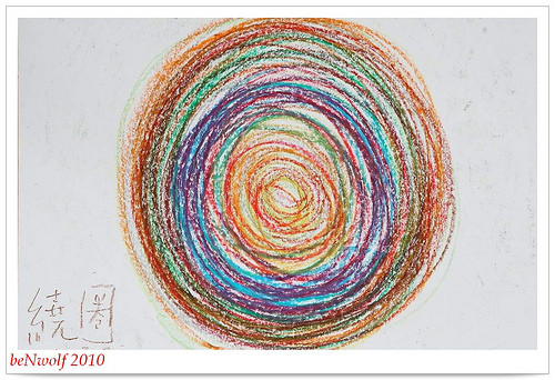 點。五種顏色的點描,毫無章法可言,不過專心在點這些色點時,整個心情是非常專注而寧靜的,很舒服的感覺;甚至還能注意到自己不經意的急躁感,提醒自己要放慢一點。