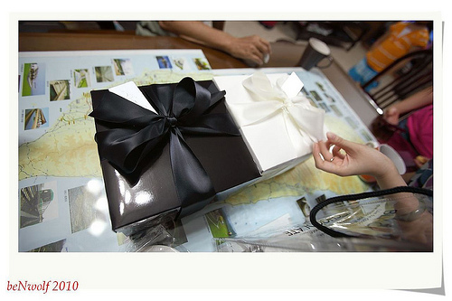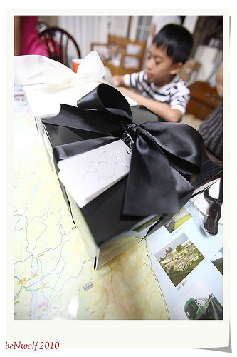 漂亮的緞帶,幾乎要比我的腰帶還要高檔,也遠遠的把我的T恤給比下去了…囧。玩電玩的,就在一旁玩起來,沒有走遠。