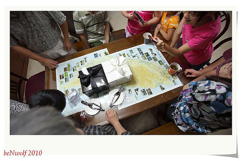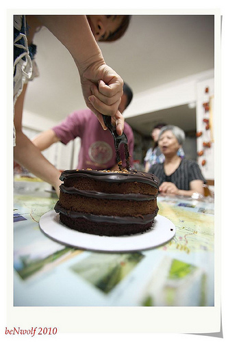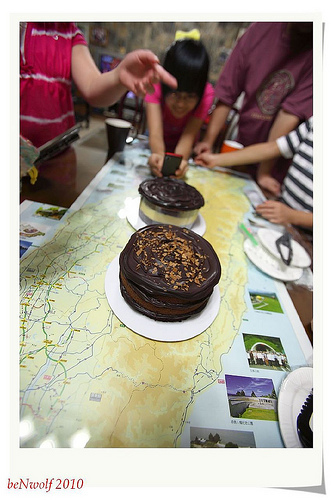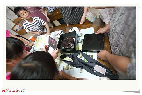 瞎咪?!老媽竟然只是把蛋糕拿出來而已,還沒有打算開盒,反而是自己拿起蛋糕盒上的小卡片讀了起來,這麼一來,大家立刻鳥獸散,看電視的去看電視,玩電玩的去玩電玩,看報紙的去看報紙…