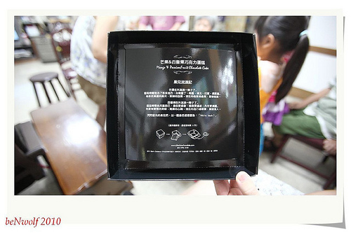 驗明正身的動作,確定沒有打錯字、切錯蛋糕、付錯金額…就是芒百香巧。小朋友,叔叔有練過,才能把蛋糕盒子這樣子翻起來。千萬別在蛋糕沒取出之前做這危險動作,否則,哼哼,蛋糕很快會成為護髮慕斯出現在你頭上~