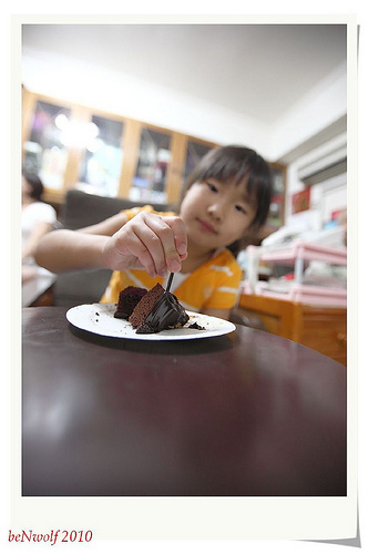 什麼?吃巧克力蛋糕時竟然表情如此平靜?!當然是配合演出擺POSE啦~我答應小姪女,只要她乖乖給我拍照,我的那塊巧克力就是她的。這招果然見效呀…