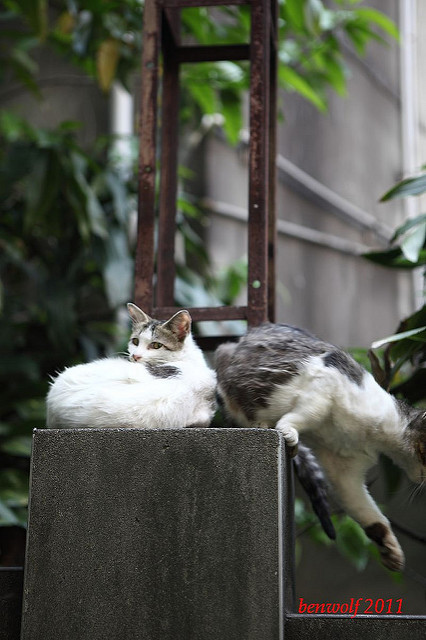 兩隻貓同時望向我,一前一後的。會是牠們過去曾受過什麼騷擾,才變得這麼怕人?或許吧…