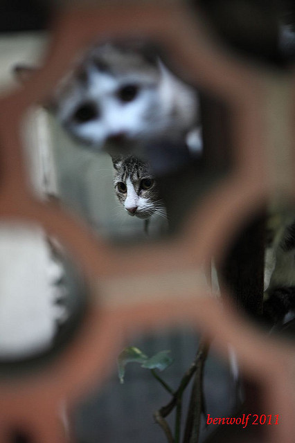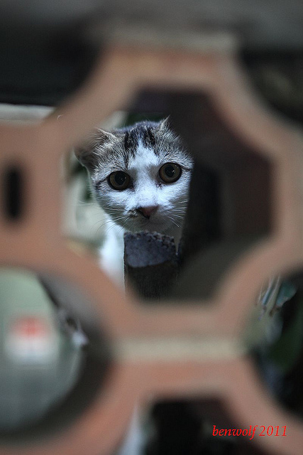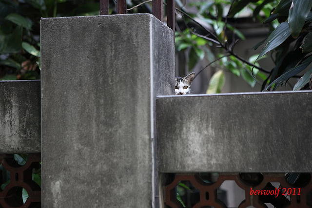 躲到牆後的貓,仍仔細觀察我的動作,會不會我要傷害牠呢?