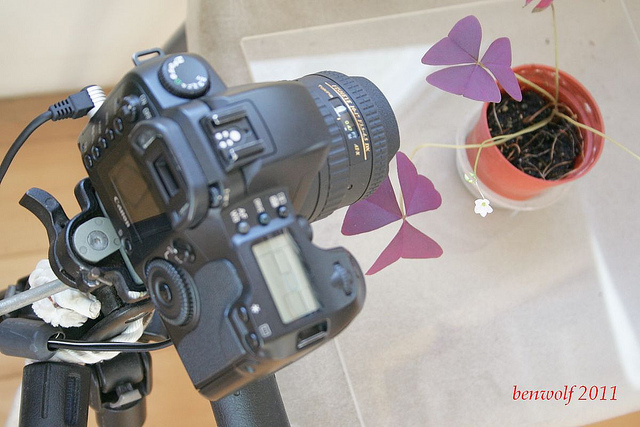 我就是這樣子架著相機在拍攝的。 大自然的造化,真神奇,24小時化成8秒鐘,葉子追著光線跑,花苞對著太陽繞。如果我的一生也這樣子間隔拍照,不曉得會是如何呢? 相機:Canon D30 鏡頭:Tokina 10-17 fisheye 器材:TC-80N3