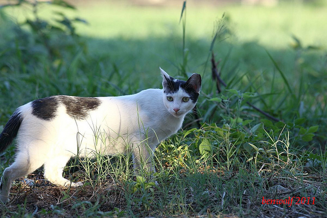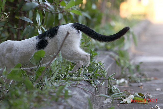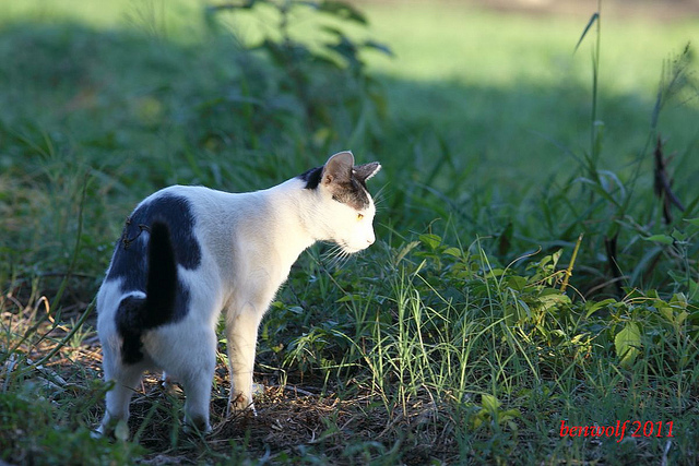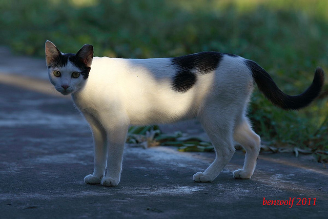 在陽光下,牠看來特別顯眼。 遠方草地的明暗,恰巧與牠身上的黑白形成對比,野草在牠身上留下輕輕的影子。輕輕的。 荷仕登黑白乳牛,貓~ 看看我沒給牠吃的,慢慢的走了。 * * * 昨夜在街上看到一位男士在餵街貓,兩隻貓兒很親熱的圍在他腳旁,尾巴也是翹得高高的。