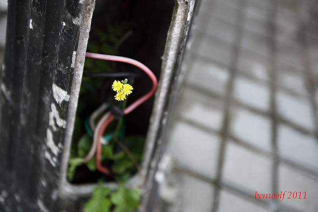 無視於斑駁的黑漆、褪色的紅色電線、看似隨意纒繞的黑色電工膠帶,黃色的兔仔草,靜靜的,努力的完成它自己,盛開。