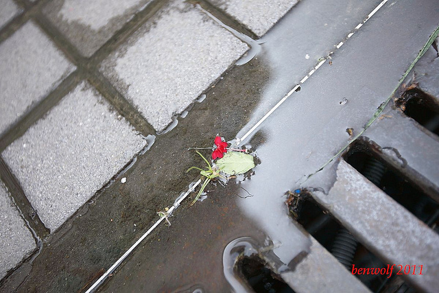 即使是躺在小水窪,它仍找到了綠色的伴,落葉與小草,努力實踐紅花需有綠草伴,無視於鐵灰的水溝蓋、陰溝裡沒有貼壁收齊的灰色纜線。