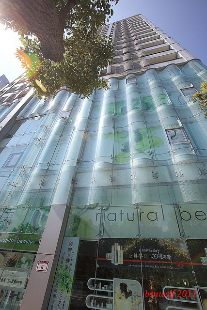 不到一百公尺處,外形亮麗、身材有致的帷幕玻璃,展現著她的妖嬌。