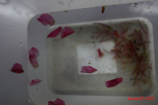 下了雨後,櫻花落地紛紛,剛好我在堤防上見到。好美呀,我想。走了幾步,又回過身來,看看身上有沒有什麼袋子或容器。就這麼巧,背包裡有個塑膠盒,便像個採茶姑娘似的唱起山歌,把擱在灌木上的櫻花一朵朵裝起來。