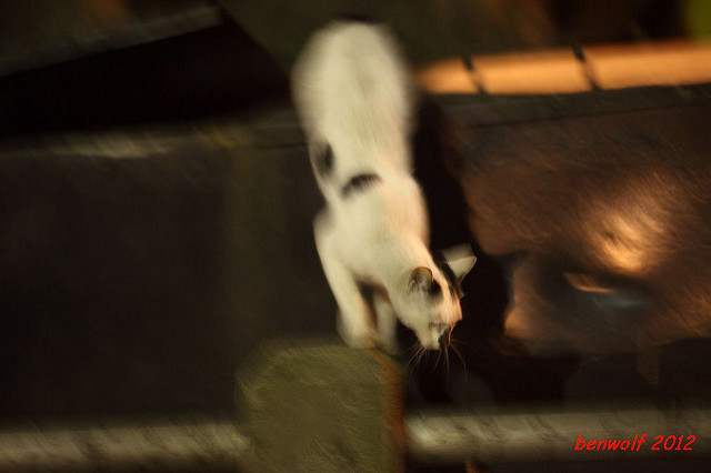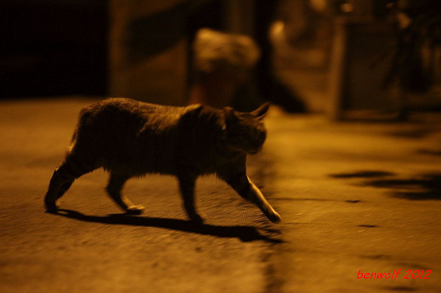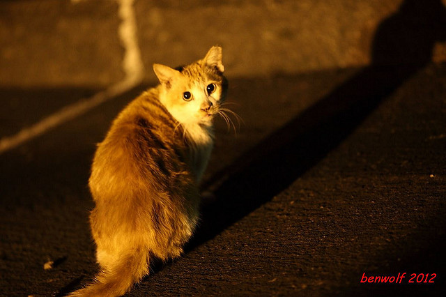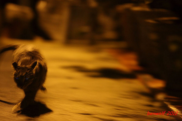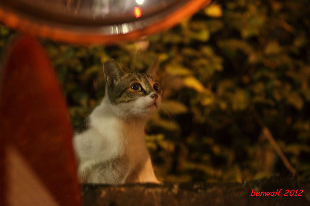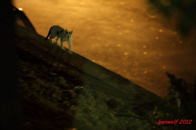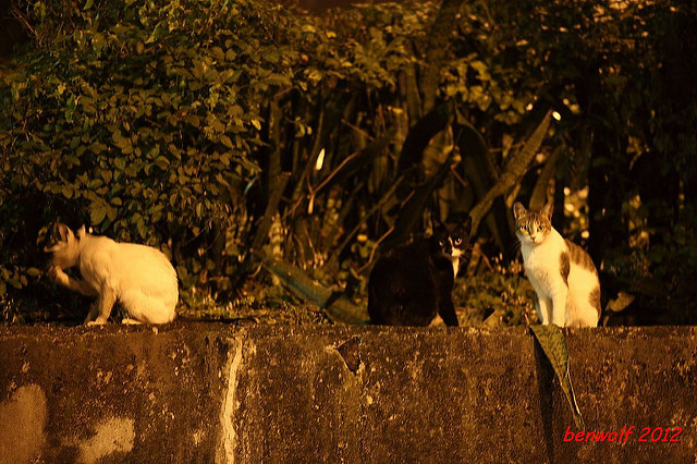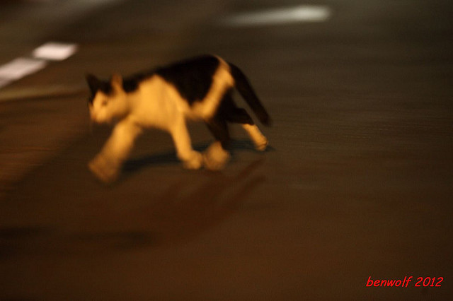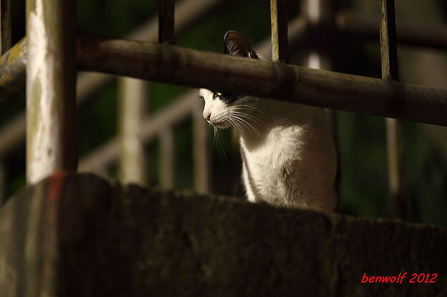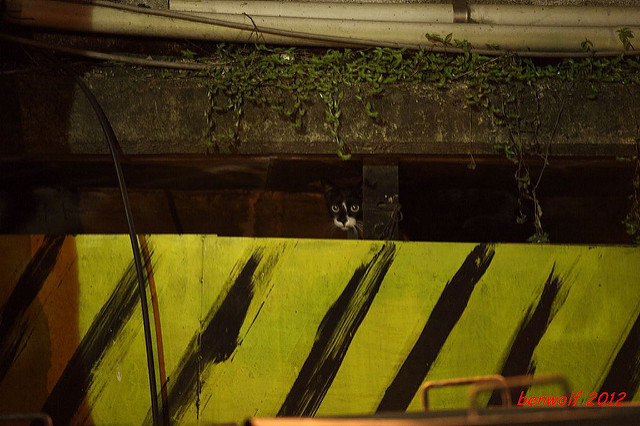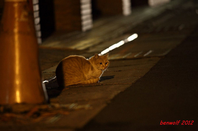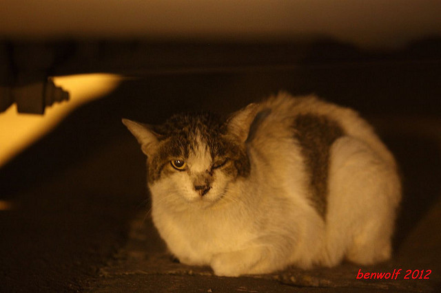 這張算是獨眼貓吧。牠就在車子底下,要不是我眼睛利,大概就錯過牠了。只是,光線低,對焦難,這一系列的夜貓子幾乎都看得出手抖動的殘影。