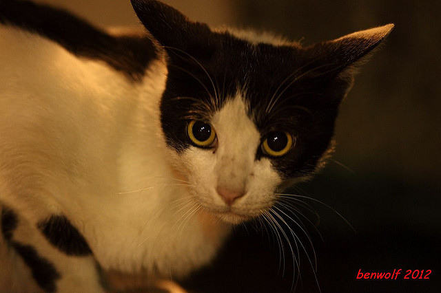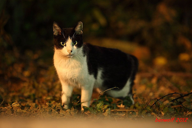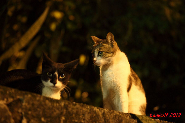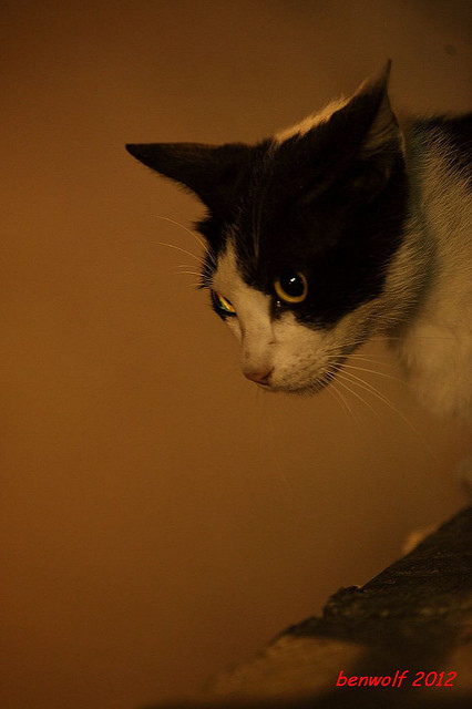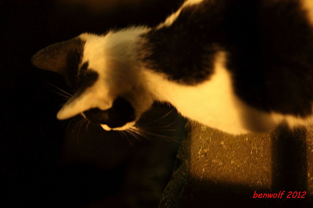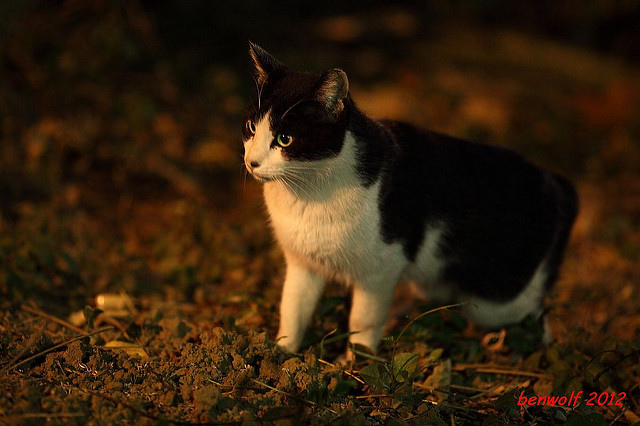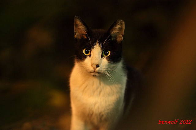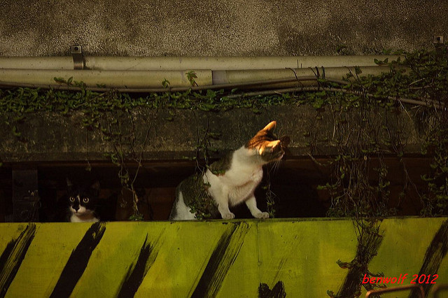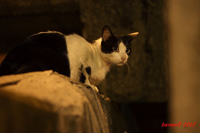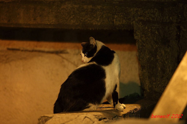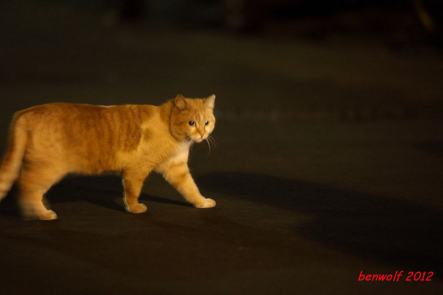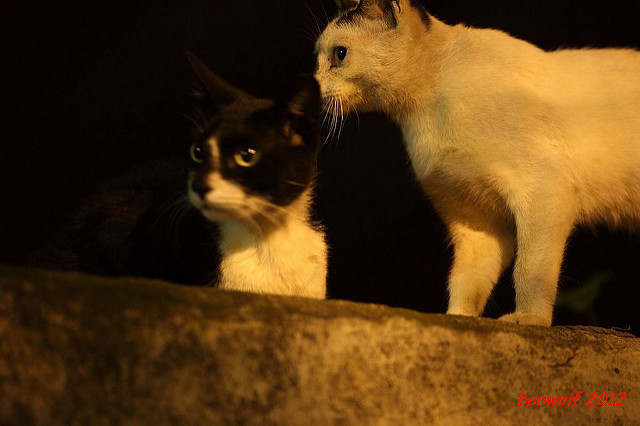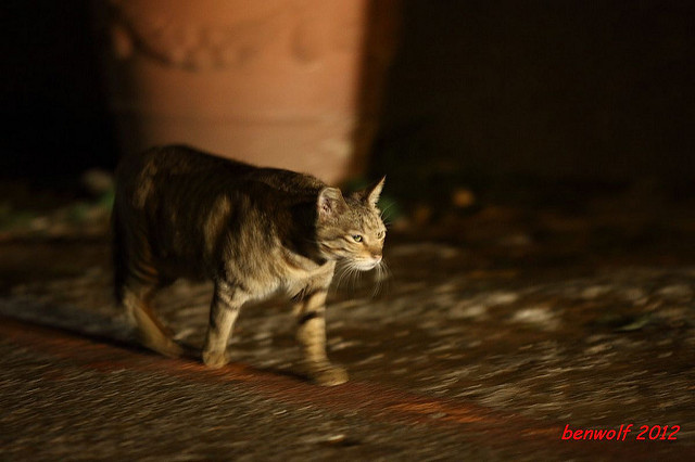 這張算是獨眼貓吧。牠就在車子底下,要不是我眼睛利,大概就錯過牠了。只是,光線低,對焦難,這一系列的夜貓子幾乎都看得出手抖動的殘影。
