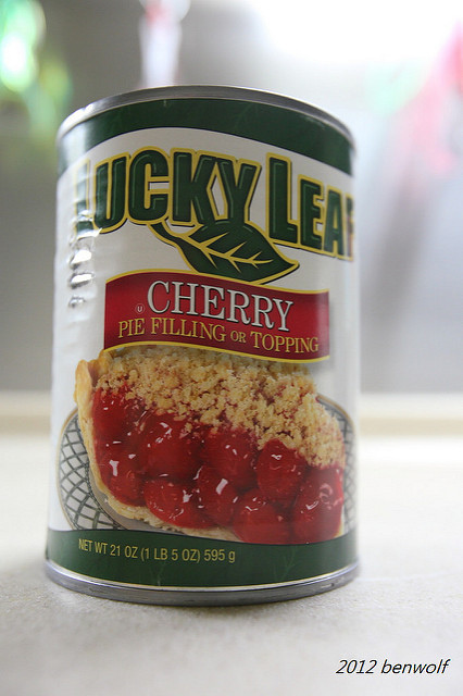 這是在大賣場裡找到的櫻桃罐頭,專門用來製作餡料的。打開罐頭後我嚐了一小口,滋味並不會很甜,想來是考慮到這都是拿來當甜點用的,甜度不高以便調整。1罐595公克,要是按照我那百分之百的配方來看,要用掉1斤的高筋麵粉來配合才是。