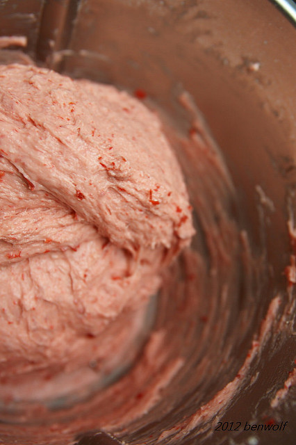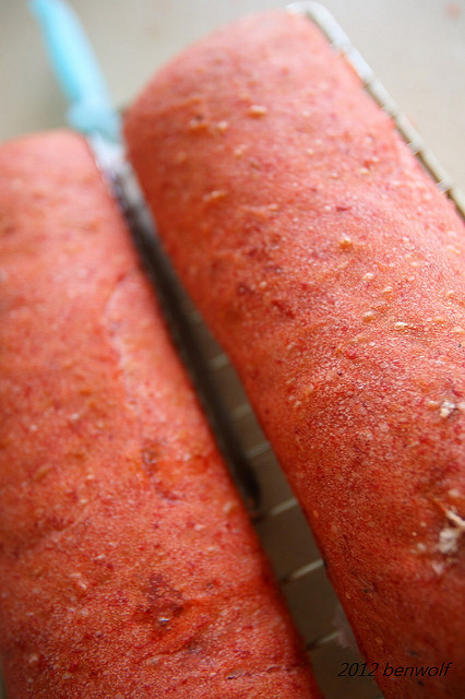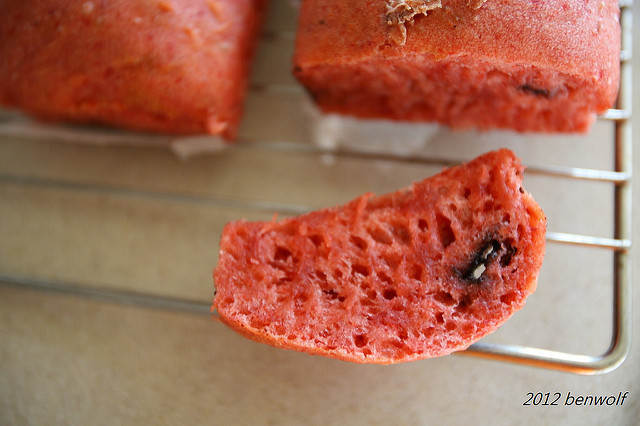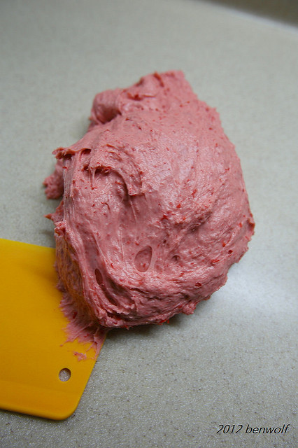 打完的麵團。乍看之下,還真的有點兒像是壽桃的顏色,只是淺了點。看來食用色素的威力比我想得還要強上許多哩~