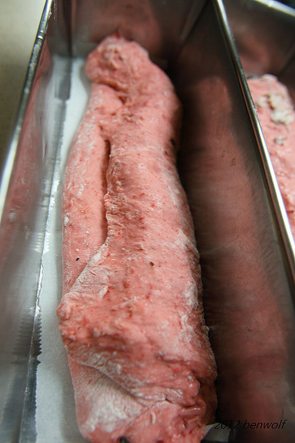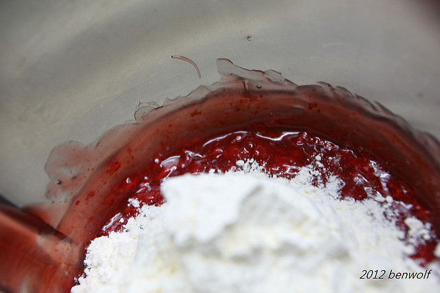 倒進食物處理器,稍微攪打,便倒進高筋麵粉,要開始打麵團了。從罐子上來看,這櫻桃餡料罐頭還摻了食用紅色色素,以及玉米粉來增加黏稠度。話說,這些額外添加的玉米粉,會不會就是導致我麵包失敗的原因呢?(藉口…)