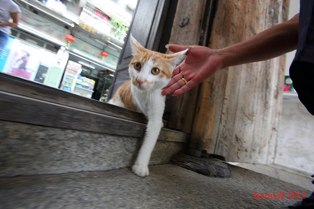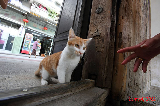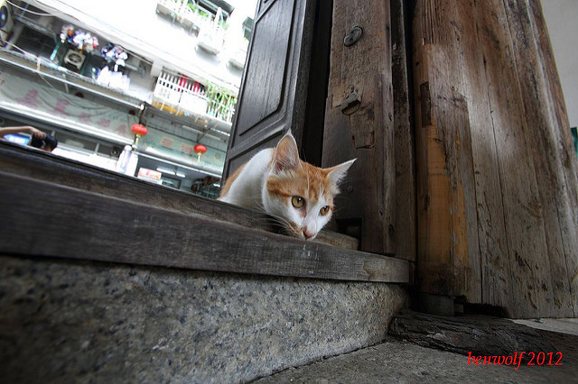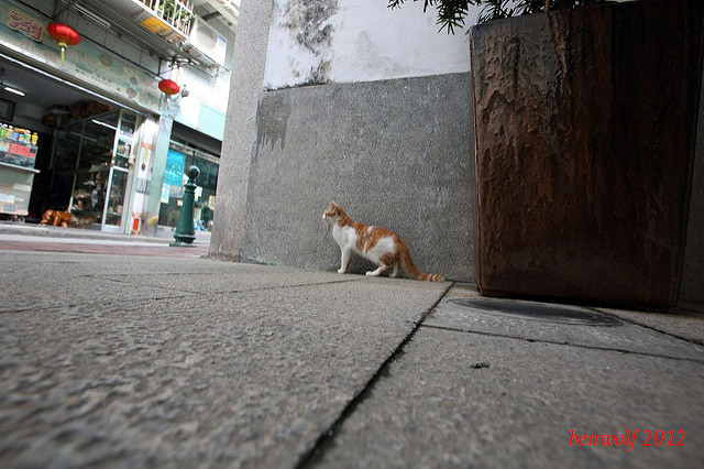 終於在鄭家大院的入口處第一次看到澳門的貓。 剛發現它時,它正望著對街的店面,大概有經常餵飼它的人,不然就是看到什麼吧。 倒是門內來個阿桑,親切的向它伸出手,那貓倒也挺親的,立刻向她靠了過去,由得她輕撫。 當那阿桑離開,貓兒退回門外,望著…