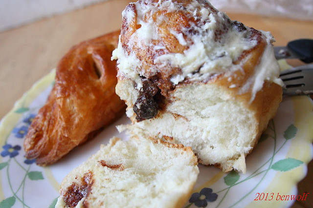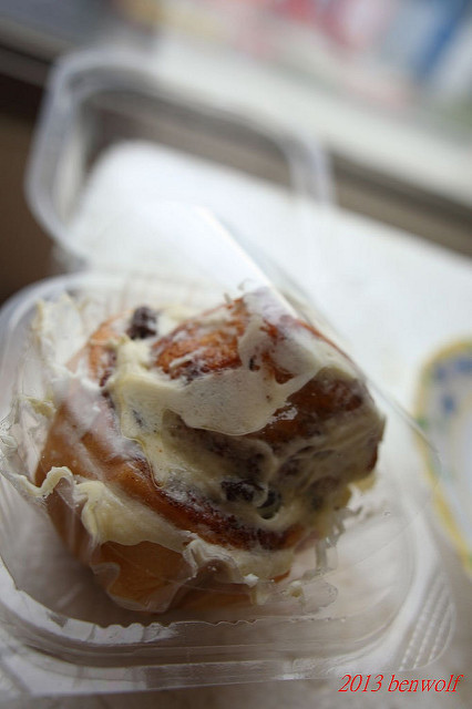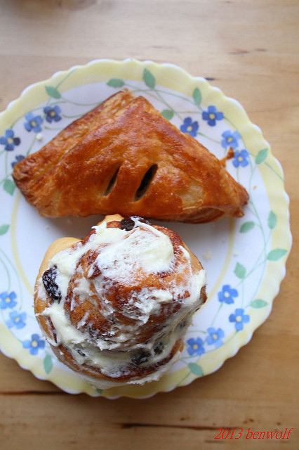 大概不是當天現買現吃,再加上又沒回烤箱再烤過一次,可頌很潮、非常的潮,潮到雙人牌水果刀都無法俐落完成工作,而肉桂捲的香氣就甭提了…