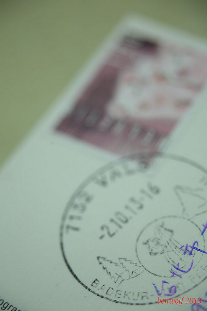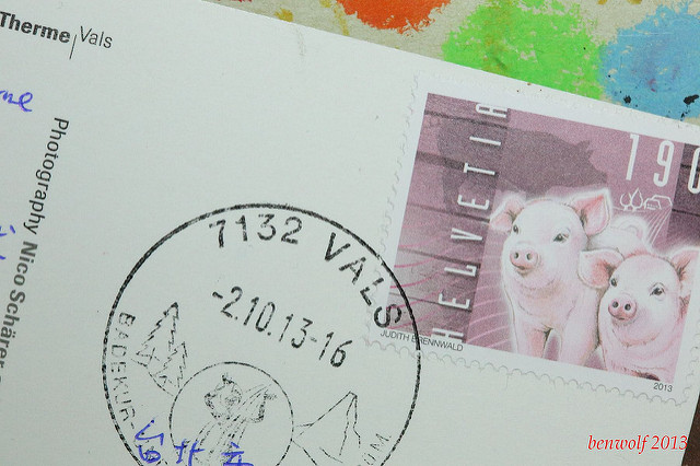 這年頭提到信箱,直覺想到的是電子信箱,至於真正的信箱,要嘛收到的是RR銀行信用卡TT自來水公司GG電話公司KK電力公司…等罄竹難書追著討錢要錢的帳單,要嘛是OO社區大學QQ補習班PP教會YY寺廟XX房屋仲介等…族繁不及備載的宣傳廣告,再不然如天降甘霖令我望穿秋水左盼右等…自己掏錢訂閱看了卻無法令我長進的雜誌,林林總總的各式紙張在我脫離「愛情青紅燈」交筆友的階段後就幾乎完全佔據了我日常生活裡的實體信箱,所以當我看這張遠自瑞士Vals寄來的明信片,簡直就像是連槓365次龜後的大樂透彩券出現在我手裡。真是驚喜!