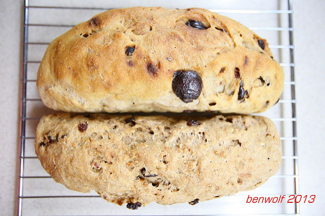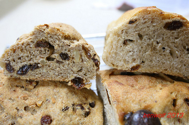 上方的麵包是40%新鮮麵粉(以下簡稱為40%),下方是60%新鮮麵粉(以下簡稱為60%),兩個麵包差別主要是新鮮麵粉比例有別,不同的固體材料則是其次-上方摻的是不含松露的松露巧克力,下方摻的是堅果;兩者皆有20%的葡萄乾。