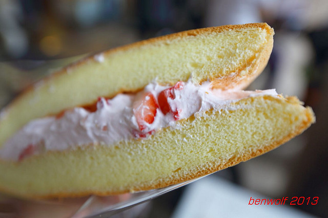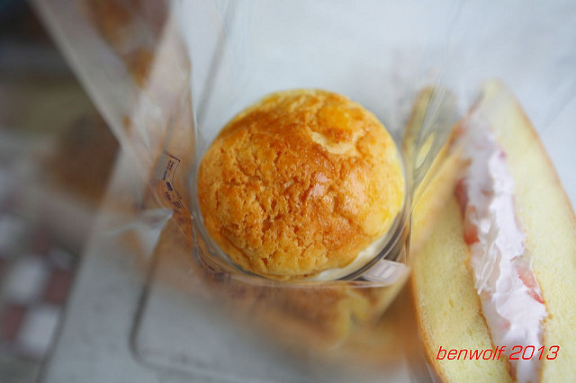 鮮奶油草莓蛋糕。這個是從架上直接拿下來的,因為它的色澤鮮豔動人,再加上拿著金得春捲邊走邊吃很快就啃掉一條的空虛感,以及店裡人山人海幾乎擠滿整個店面的人龍,讓我一時失去理智,立馬就拿了一個。還不錯,可惜不是特色產品才會放在中島展示架上等人來拿。