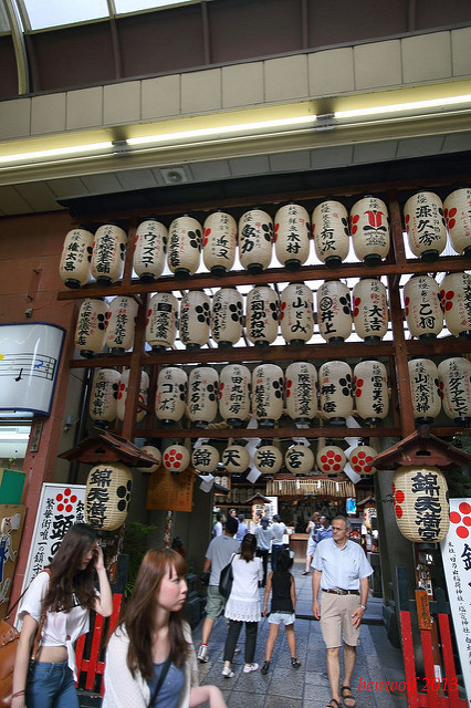 這些所謂的通,或可說是巷弄,尤其是在商店街。挑高的雨遮採用五顏六色的玻璃(壓克力?),往來的人客在這午後的京都,大抵是各地來的觀光客,至於本地人,差不多已經買好菜回家了吧。地面是絕對的乾淨,看得到原本路面的顏色,這點是台灣市場很難看到的特色。