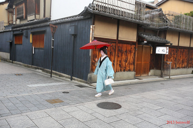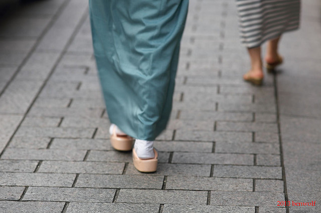 許多遊客換了浴衣在這小路上漫步,儘管無法像藝伎般引發眾人追逐拍照,卻有股怡然自得的樂趣在。我也只敢遠遠的拍著她的背影。