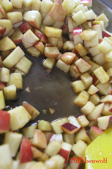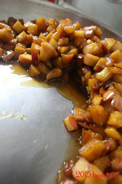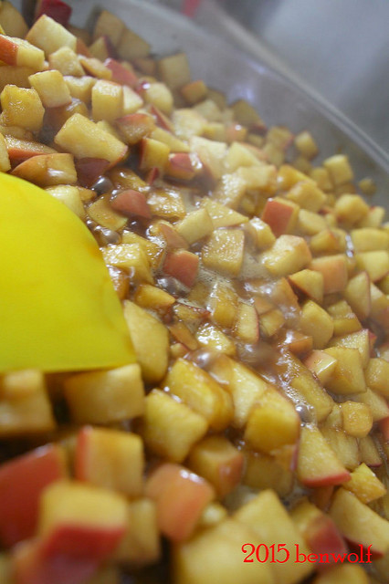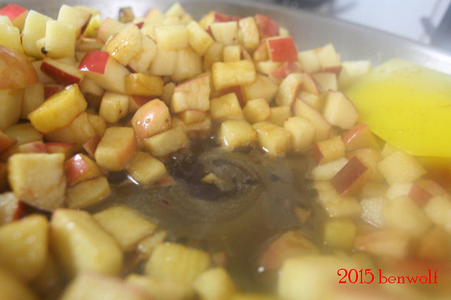 大約不到10分鐘,蘋果會開始出汁。基本上這個階段,完全可以不必理會鍋子裡的蘋果煮得如何,反正會出不少的水。鍋子小火,放著,時間都放在打奶油上,偶爾瞄一下鍋子即可。