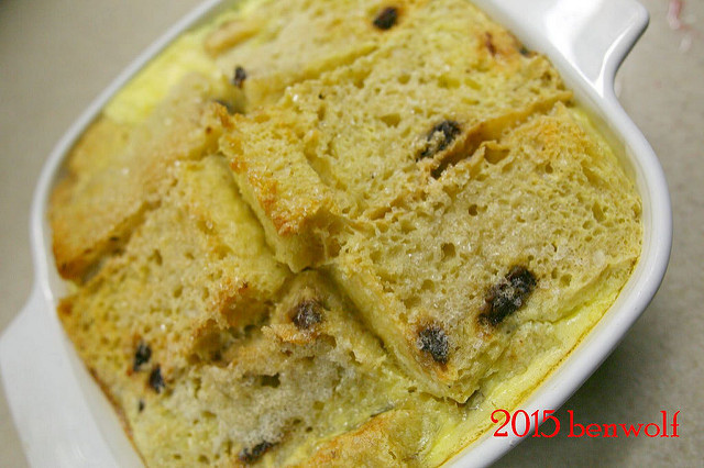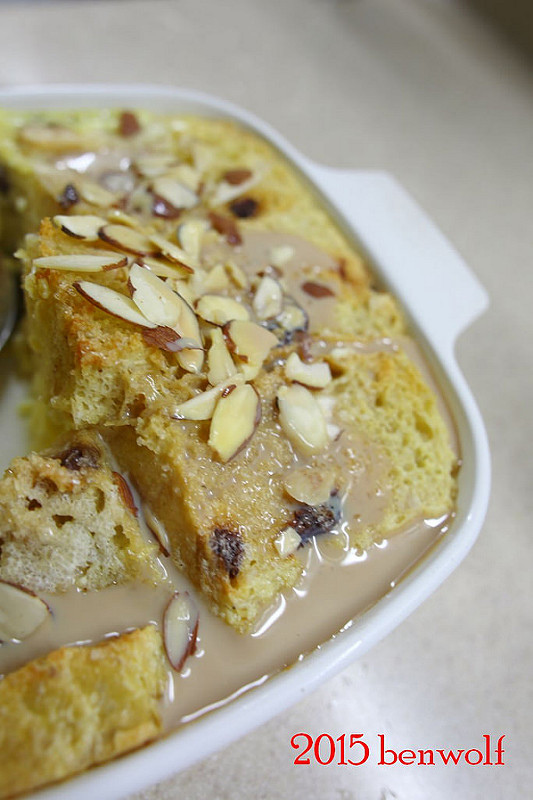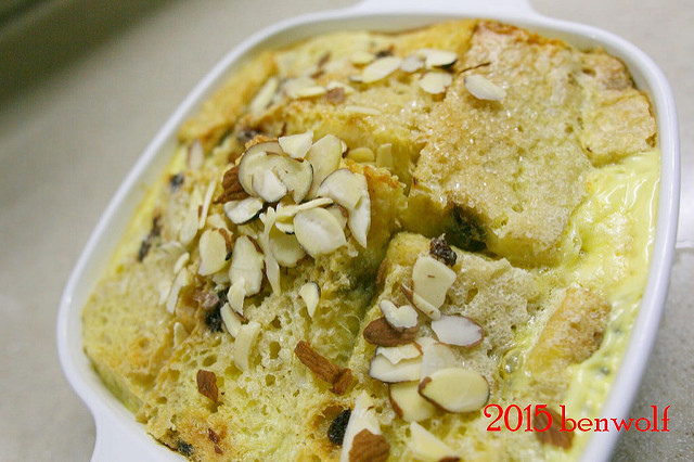在擺放好的麵包上,倒入已攪拌完成的雞蛋鮮奶油液,最後再放入烤箱中,190度,30分鐘。