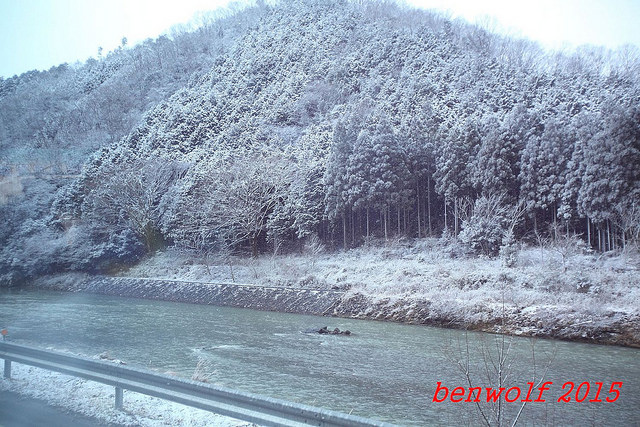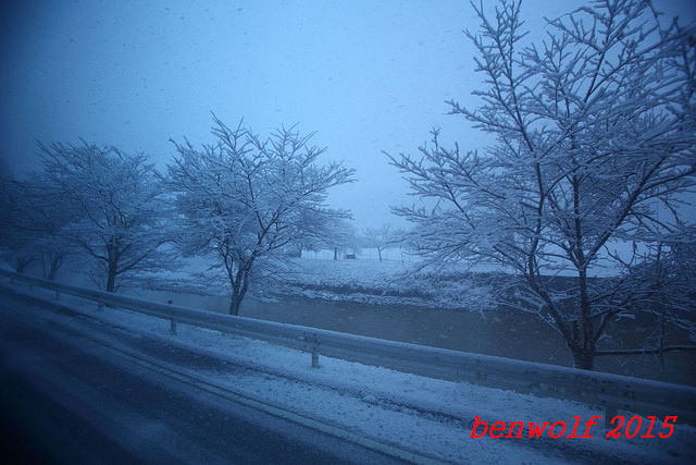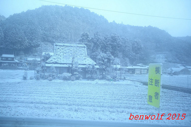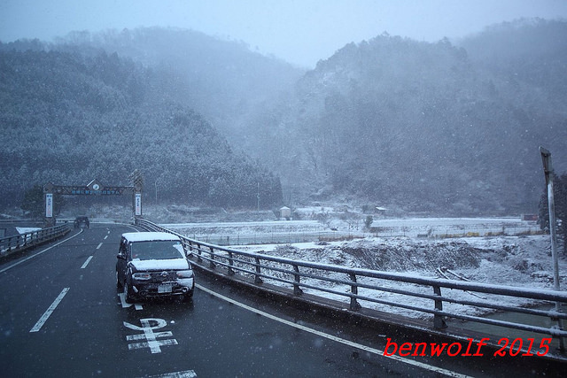 對向車道的車輛,所有向著天空的平面,車頂、引擎蓋,都蒙上一層白雪。這更讓我期待即將到達的美山會是怎麼的雪景。