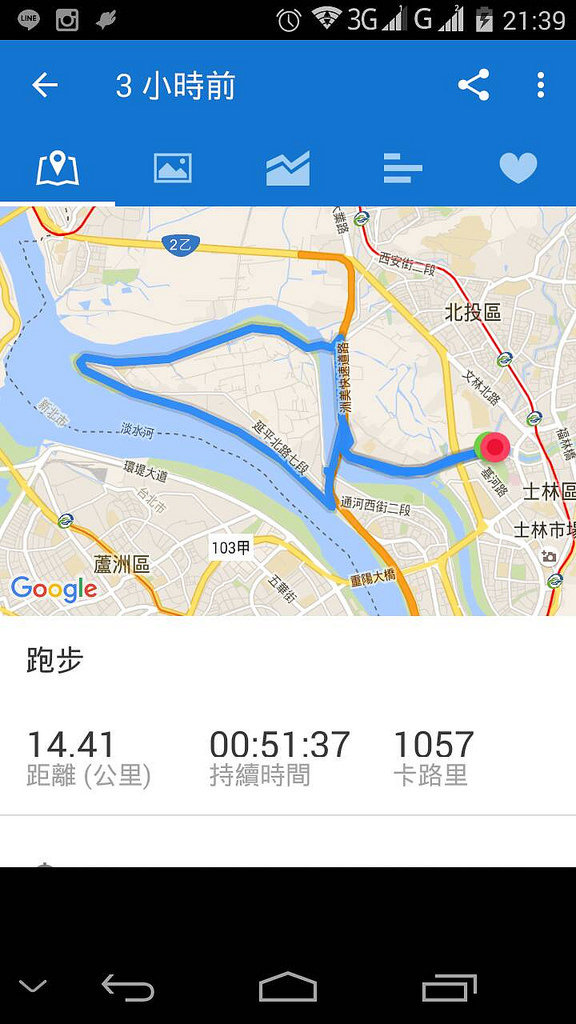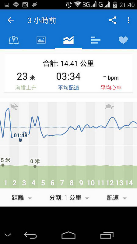 雖說這個軟體搭配陽春手機,跑步或走路時很容易路線會亂飄,一下子飛過河、一下子衝到對岸…但騎腳踏車的速度夠快,自然路線記錄就很平順,不會有暴衝現象。總共騎了14公里,花了51分鐘,平均下來3分34秒騎完1公里,至少落了大半年的體力,沒有完全衰退。