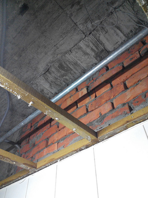 望著廚房天花板掉落後留下來的謎樣空間,磚頭裸露無遺,相較於其他沒有天花掩飾的牆面,這兒簡直是化外之地。