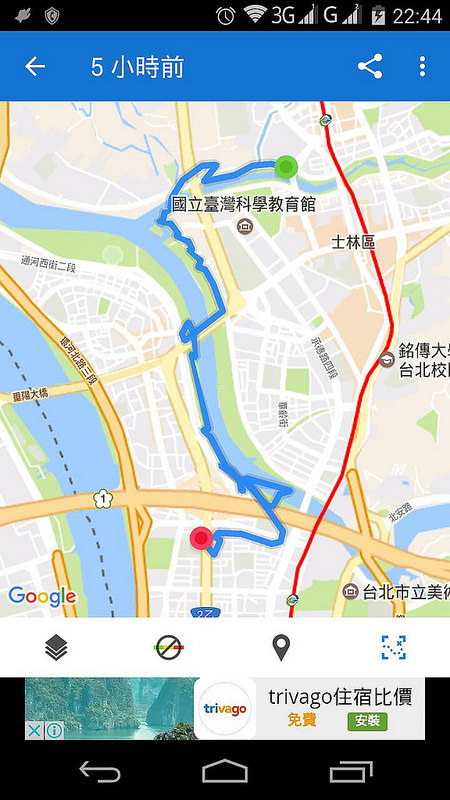 快樂手機上的路線圖。另一個檔案顯示我在1小時3分鐘內,走了7.3公里-幾乎是比我慢跑的速度還快。想也不可能,因為圖中間的藍色線段竟然飄到基隆河對岸的劍潭又再飛回來。