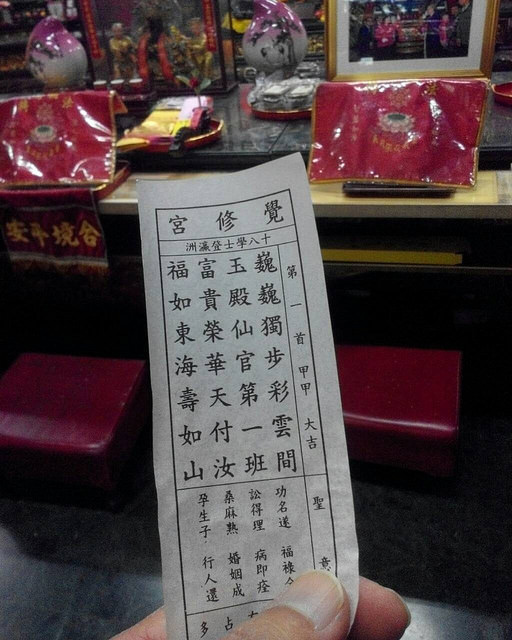 前三四隻籤都擲無聖筊,想著會不會是我問錯了-之前拿到I-20猶豫著到底要不要出國讀書時,到淡水清水巖祖師廟求籤,擲了好多次都沒有,直到我改問「是不是我自己還沒想清楚要問什麼」,立刻得到聖筊。這回覺修宮的祖師爺應允得毫不遲疑,倒是數度得不到適合我的籤文。