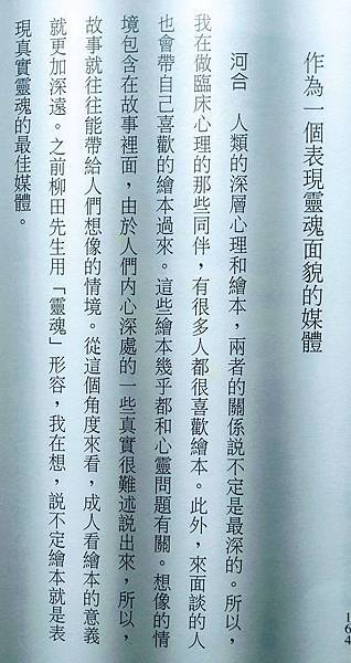 「人類的深層心理和繪本,兩者的關係說不定是最深的。所以,我在做臨床心理的那些同伴,有很多人都很喜歡繪本。此外,來面談的人也會帶自己喜歡的繪本過來。這些繪本幾乎都和心靈問題有關。想像的情境包含在故事裡面,由於人們內心深處的一些真實很難述說出來,所以,故事就往往能帶給人們想像的情境。從這個角度來看,成人看繪本的意義就更加深遠。之前柳田先生用『靈魂』來形容,我在想,說不定繪本就是表現真實靈魂的最佳媒體。」《繪本之力》