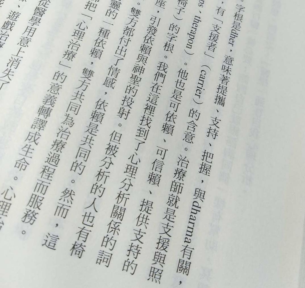 與心理分析相關的字源:希臘文therapeia也意味著照料。字根是dher,意味著提攜、支持、把握,與dharma有關,這個梵文意味著「習性」與「習慣」,有「支援者」(carrier)的含義。治療師就是支持與照料的人,如同僕人一樣(希臘文是theraps、therapon)。《自殺與靈魂》